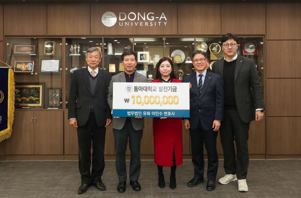지난 21일 동아대 승학캠퍼스 총장실에서 열린 발전기금 전달식엔 이해우 총장과 이인수 변호사, 송시섭 법학전문대학원장, 송강직 대학원장, 박현태 대외국제처장이 참석했다.