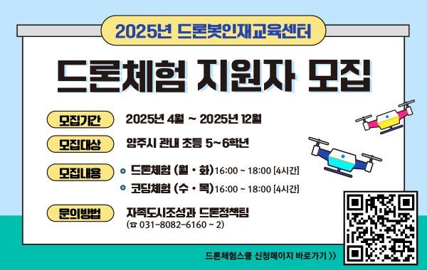 경기 양주시(시장 강수현)가 24일부터 관내 초등학교 5~6학년 학생을 대상으로 드론봇인재교육센터 내 드론체험 스쿨을 모집한다고 밝혔다.