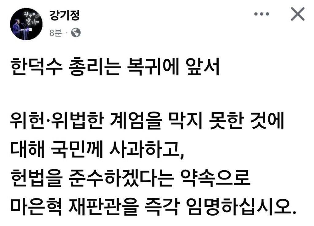 강 시장은 이날 페이스북에 올린 글을 통해 “(탄핵소추가 기각돼 대통령 권한대행직에 복귀한) 한덕수 총리는 복귀에 앞서 위헌·위법한 계엄을 막지 못한 것에 대해 국민께 사과하라”며 “헌법을 준수하겠다는 약속으로 마은혁 재판관을 즉각 임명하라”고 밝혔다.