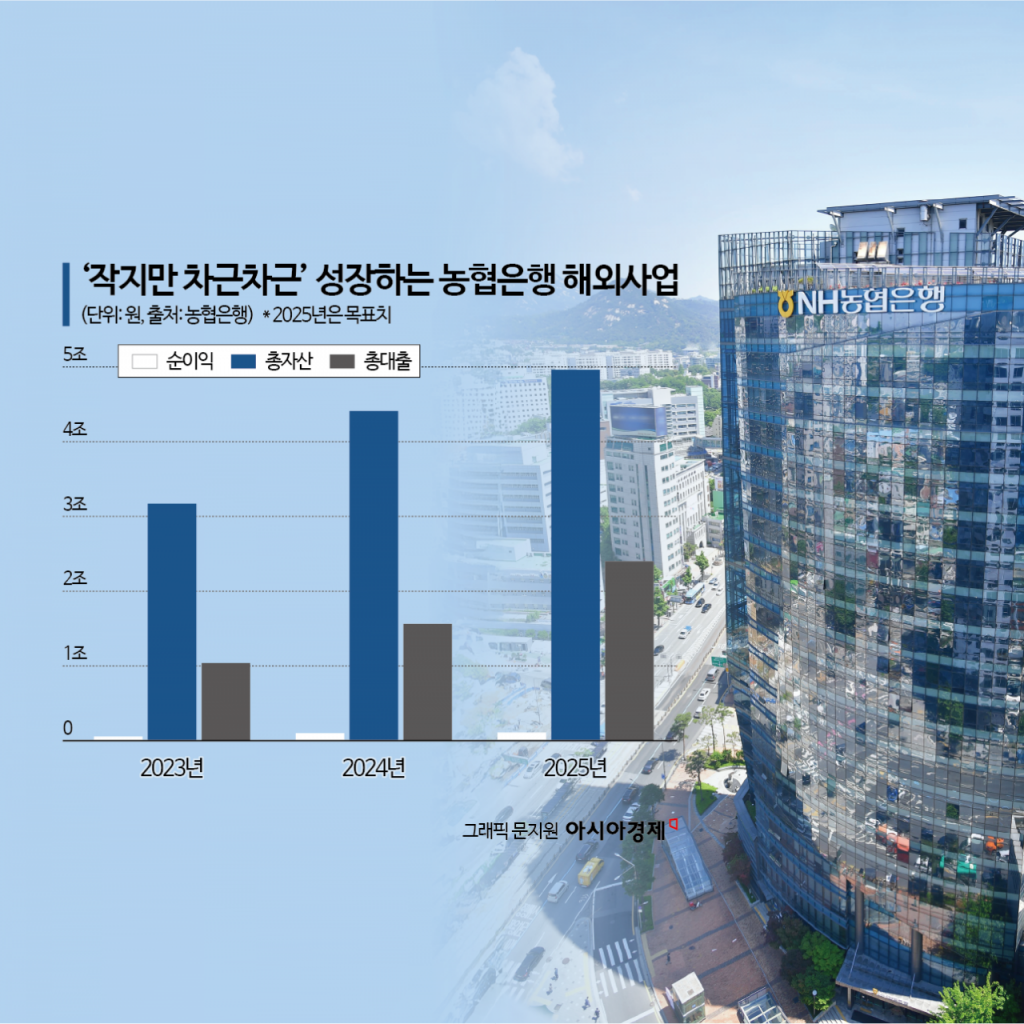 25일 금융권에 따르면 농협은행은 최근 글로벌 사업 중점 추진 계획을 실행하고 있다. 올해 글로벌 당기순이익 300억원을 목표로 세웠다. 구체적으로 총자산 4조9608조원, 총대출 2조4062억원을 달성하고자 한다. 이는 지난해에 비해 각각 5527억원, 8444억원이 증가한 수치다. 농협은행의 글로벌 사업은 꾸준히 성장하고 있다. 2023년 당기순이익 154억원, 지난해에는 277억원을 기록했다. 총자산은 3조1724억원에서 4조4081억원으로 증가했으며 대출자산(1조368억원→1조5618억원)과 무역금융(9464억원→1조4153억원) 규모가 모두 늘었다. 농협은행은 핵심 국내 영업본부 수준까지 글로벌 사업을 끌어올리겠다는 계획을 세웠다. 중기 손익목표 1000억원, 장기적으로는 은행 순이익의 10% 수준인 2000억원까지 순이익을 거두겠다는 목표다.