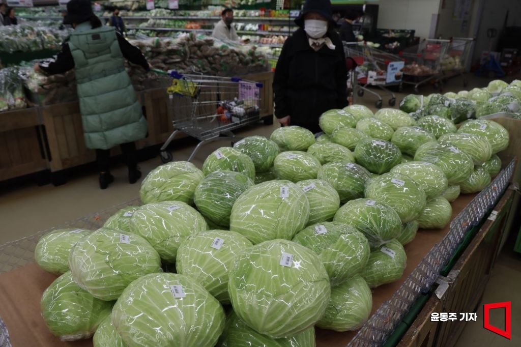 양배추, 무, 당근 등 채소 가격이 줄줄이 오르며 밥상물가 우려가 현실이 되고 있다. 24일 서울 양재 하나로마트에서 양배추가 진열되어 있다. 양배추 판매 가격은 6,380원에서 정부지원을 받아 5,104원에 판매되고 있다.