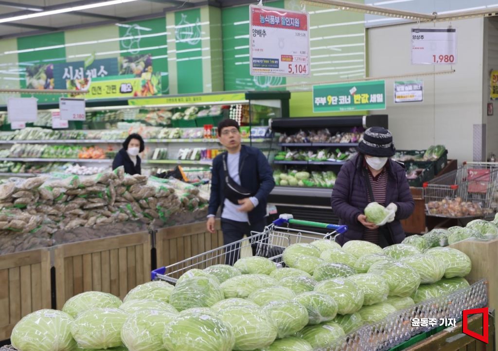양배추, 무, 당근 등 채소 가격이 줄줄이 오르며 밥상물가 우려가 현실이 되고 있다. 24일 서울 양재 하나로마트에서 양배추가 진열되어 있다. 양배추 판매 가격은 6,380원에서 정부지원을 받아 5,104원에 판매되고 있다.