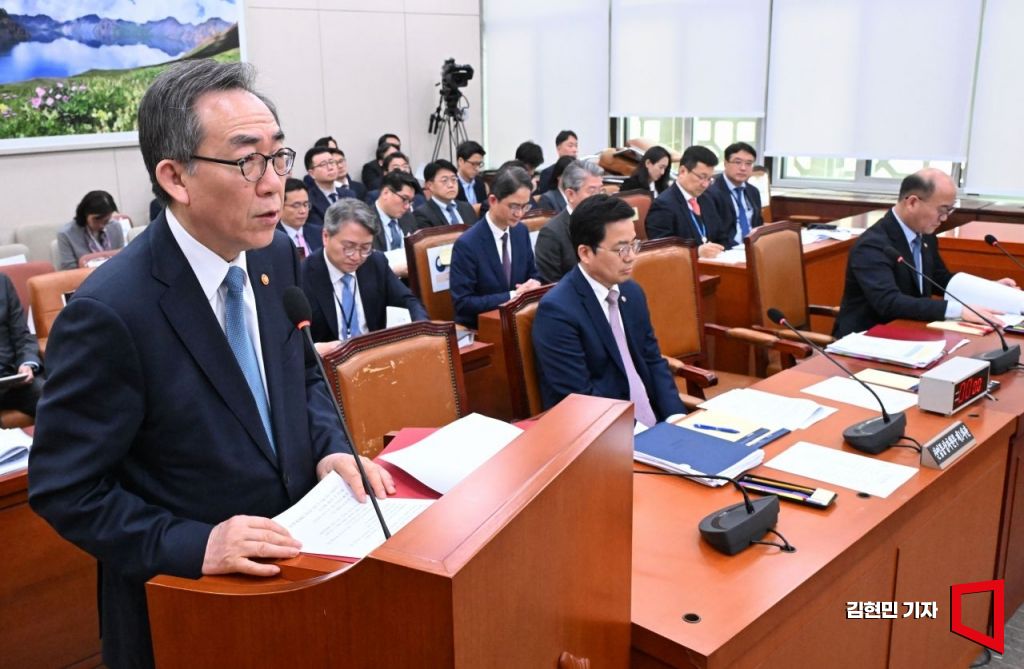 24일 국회에서 미국 에너지부가 한국을 민감국가로 지정한 문제와 관련 현안질의 등을 위해 열린 외교통일위원회 전체회의에서 조태열 외교부 장관이 업무보고를 하고 있다.
