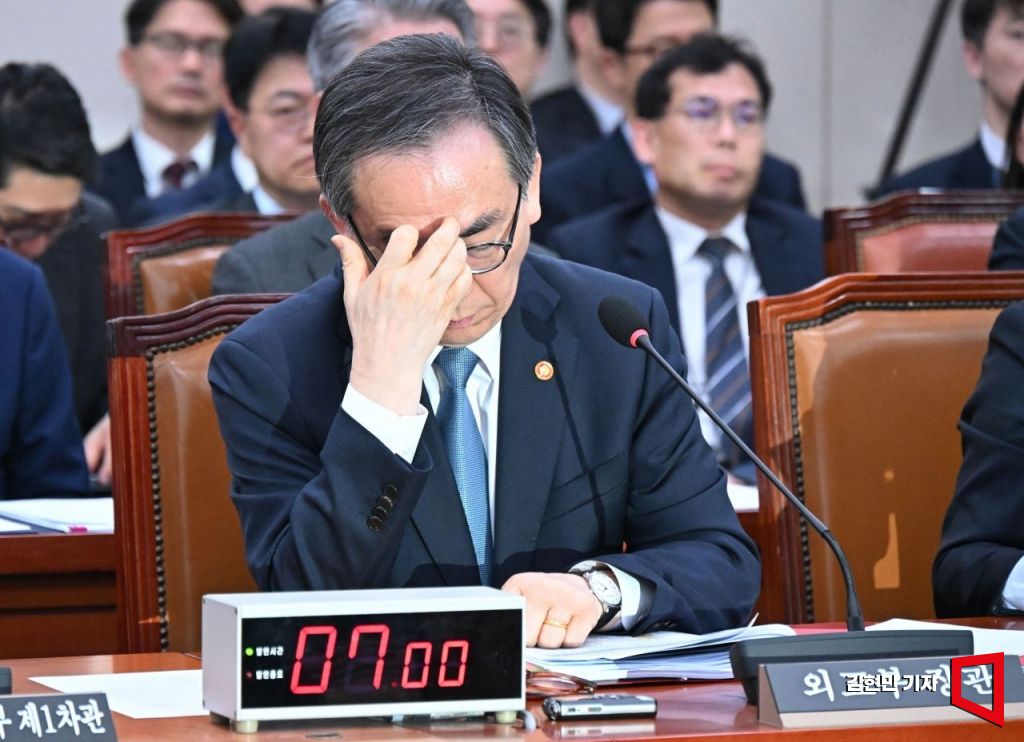 24일 국회에서 미국 에너지부가 한국을 민감국가로 지정한 문제와 관련 현안질의 등을 위해 열린 외교통일위원회 전체회의에서 조태열 외교부 장관이 의원 질의를 듣고 있다.