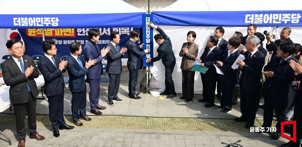 이재명 더불어민주당 대표와 박찬대 원내대표가 24일 서울 광화문에서 천막당사 현판식을 갖고 있다. 2025. 03. 24 윤동주 기자