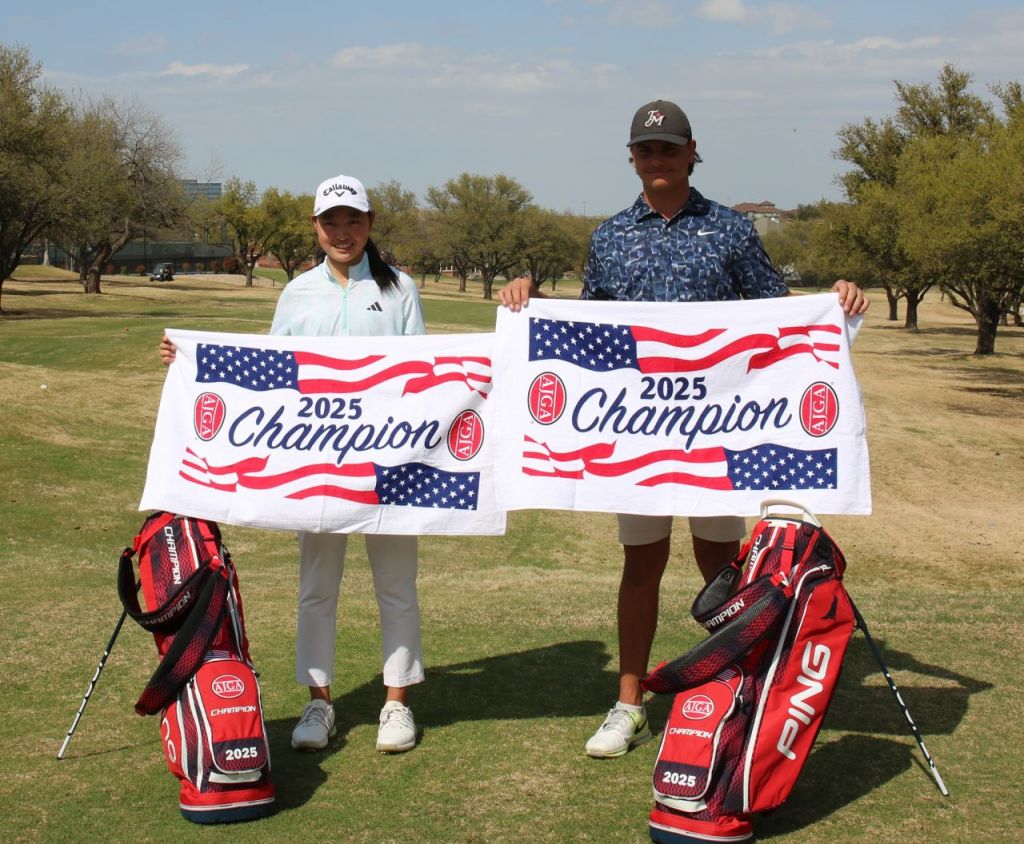 앤절라 장(왼쪽)과 체이스 휴스가 텍사스 주니어 챔피언십 남녀부 우승 직후 기념 촬영을 하고 있다. 사진제공=퍼시픽링스코리아