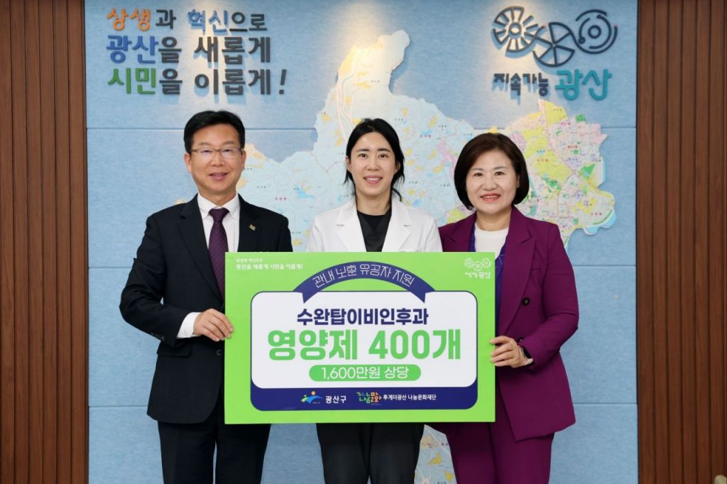 수완탑이비인후과가 24일 광산구청을 찾아 관내 보훈 유공자들을 위한 영양제 400개(1,600만원 상당)를 기탁했다. 전달식에는 김문준 수완탑이비인후과 대표원장(가운데), 이옥근 투게더나눔문화재단 사무처장(오른쪽), 광산구 관계자 등이 참석했다. 기탁된 물품은 광산구 내 보훈단체 10곳에 배분된다. 광주 광산구 제공