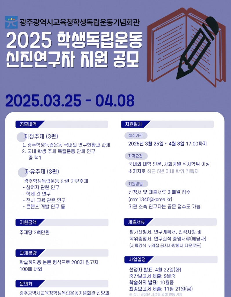 지원 자격은 국내외 인문·사회계열 석·박사학위 소지자 중, 학위 취득 후 5년 이내인 연구자다. 신청자는 광주학생독립운동기념회관 누리집 공지사항에서 관련 서류를 내려받아 작성한 뒤, 이메일 또는 우편으로 제출하면 된다.