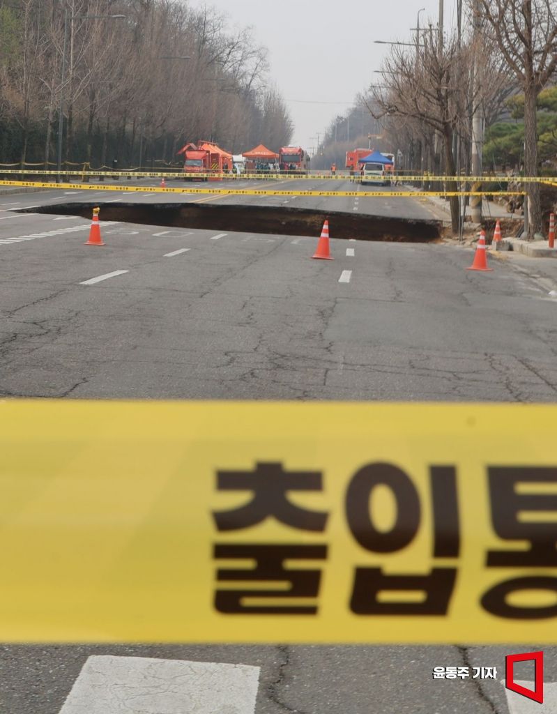 지난 24일 서울 강동구 대명초등학교 인근 사거리에서 4개차로에 걸친 '대형 싱크홀(땅꺼짐)' 이 발생했다. 25일 사고 현장 주변이 통제되고 있다. 싱크홀에는 승용차 1대와 오토바이 1대가 빠졌으며, 승용차 탑승자 1명은 인근 병원으로 이송됐다. 현재 싱크홀 아래에는 오토바이 운전자 1명이 매몰돼 있다. 깊이는 30m로 추정된다. 2025. 03. 25 윤동주 기자