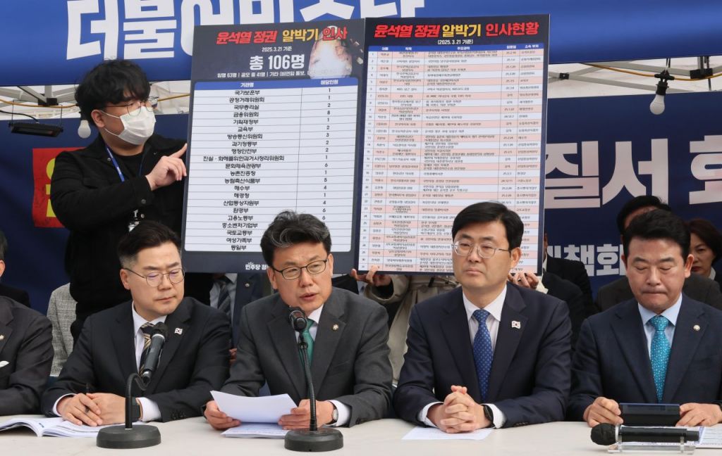 민주당 정책위가 지목한 윤 정권 알박기 인사에는 ▲12.3 비상계엄 직후인 지난해 12월 5일 임명된 권병준 공용홈쇼핑 상임감사(자유한국당 부대변인 출신) ▲지난 1월 임명된 최춘식 한국석유관리원장 (전 국민의힘 의원) ▲2월에 임명된 이주수 한국 에너지정보문화재단 대표(국민의힘 서울시 의원 출신) 등이다.