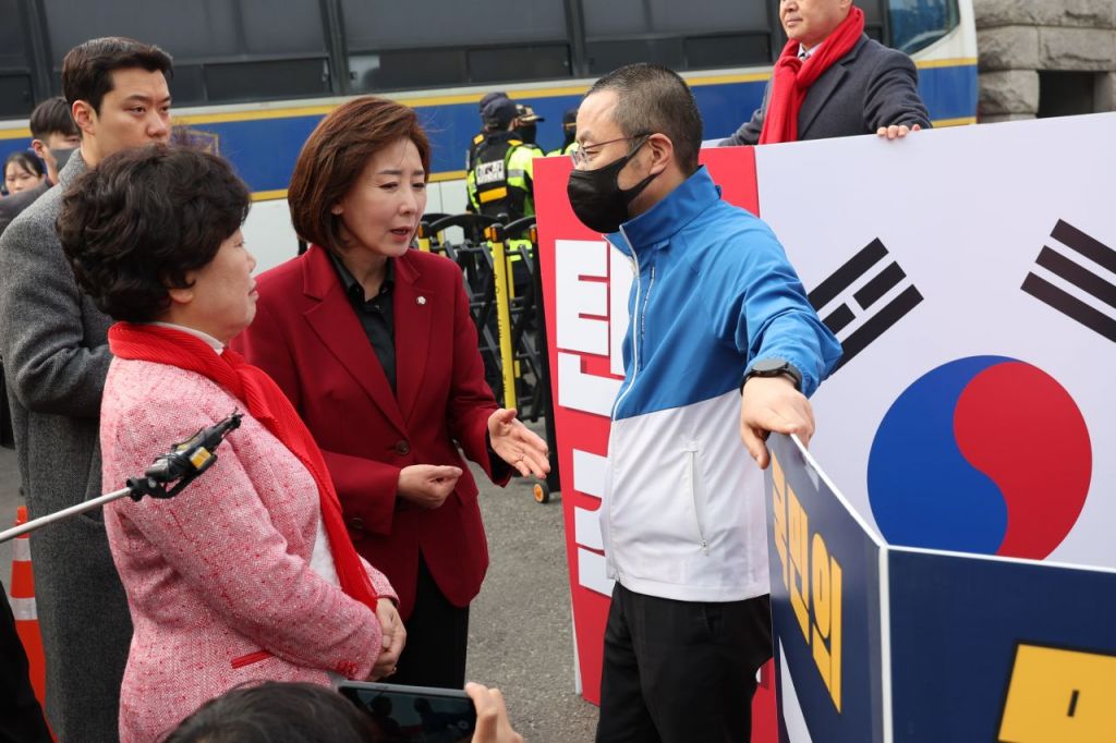 25일 서울 종로구 헌법재판소 앞에서 윤석열 대통령 탄핵 반대 피케팅 하던 국민의힘 조배숙(왼쪽부터), 나경원 의원과 윤 대통령 파면 촉구 피케팅을 준비하던 더불어민주당 박홍배 의원이 대화하고 있다. 연합뉴스