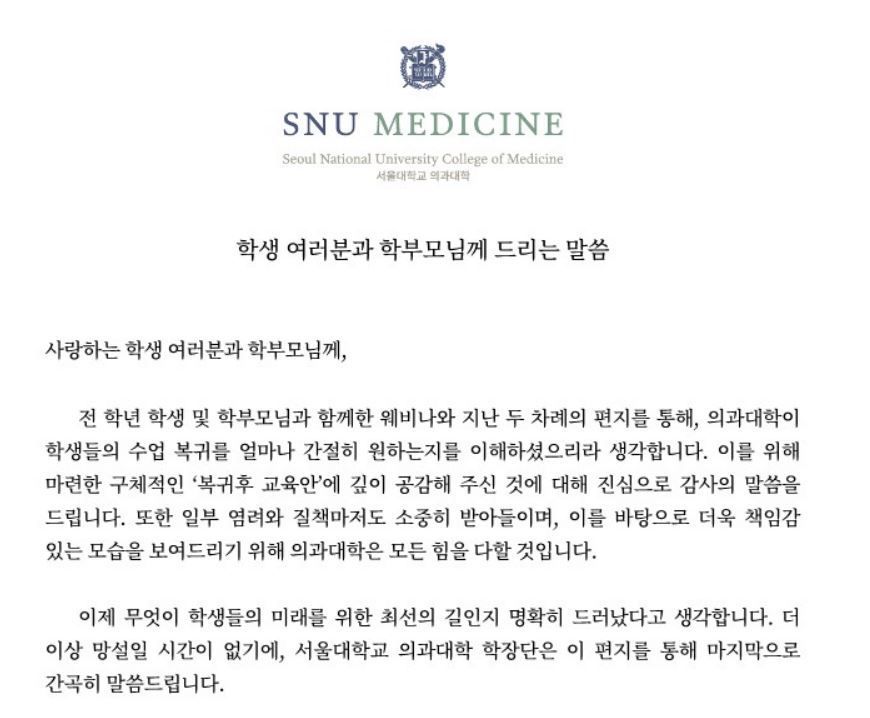서울대 의대 학장단은 25일 서울대 의대 홈페이지에 게시된 '학생 여러분과 학부모님께 드리는 글'을 통해 "더 이상 망설일 시간이 없기에 이 편지를 통해 마지막으로 간곡히 말씀드린다"며 "이제 용기를 내 부디 복귀해주시길 다시 한번 간절히 요청한다"고 했다.