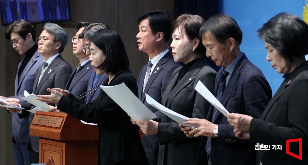 더불어민주당 사법정의실현 및 검찰독재대책위원회 의원들이 25일 국회에서 기자회견을 열어 이재명 대표의 공직선거법 항소심에 대한 공정한 판결을 촉구하고 있다.