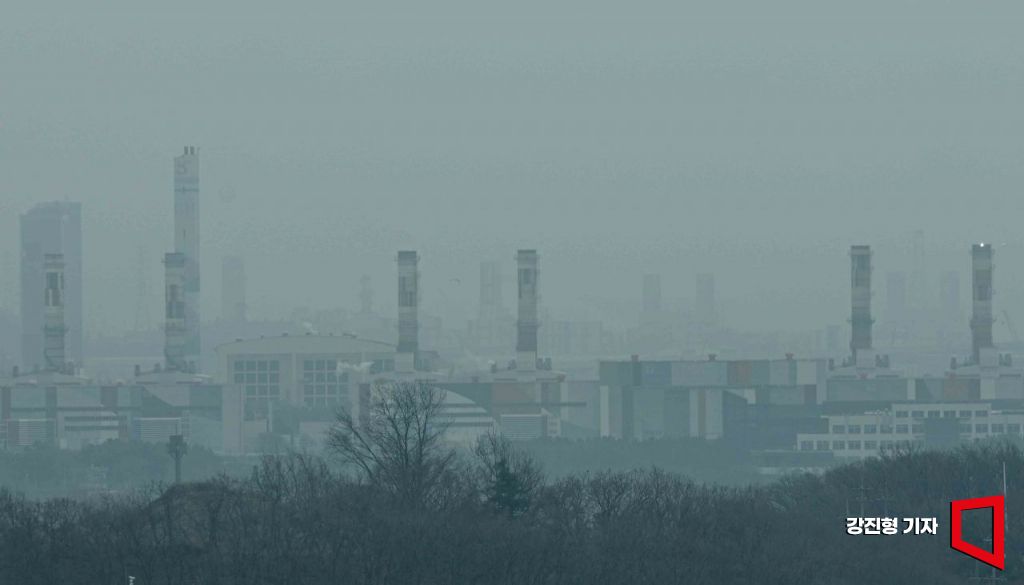 서울과 인천 등 수도권을 비롯해 전국 곳곳에 미세먼지 주의보가 발령된 25일 인천 서구 아라타워 전망대에서 바라본 인천 공장지대가 미세먼지에 싸여 있다.