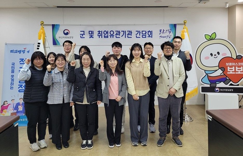 부산지방보훈청 제대군인지원센터가 군인사담당자·취업지원기관과 간담회를 갖고 기념촬영하고 있다. 부산지방보훈청 제공