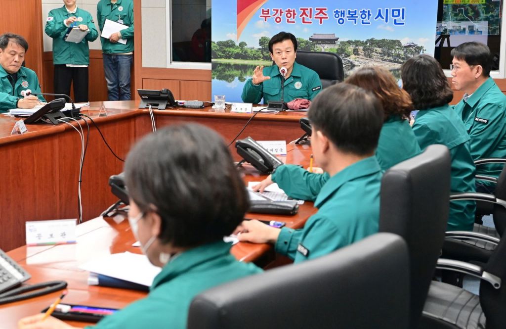 진주시 산불 재난 심각단계에 따른 산불 예방 상황 판단 회의를 진행 하고 있다 .