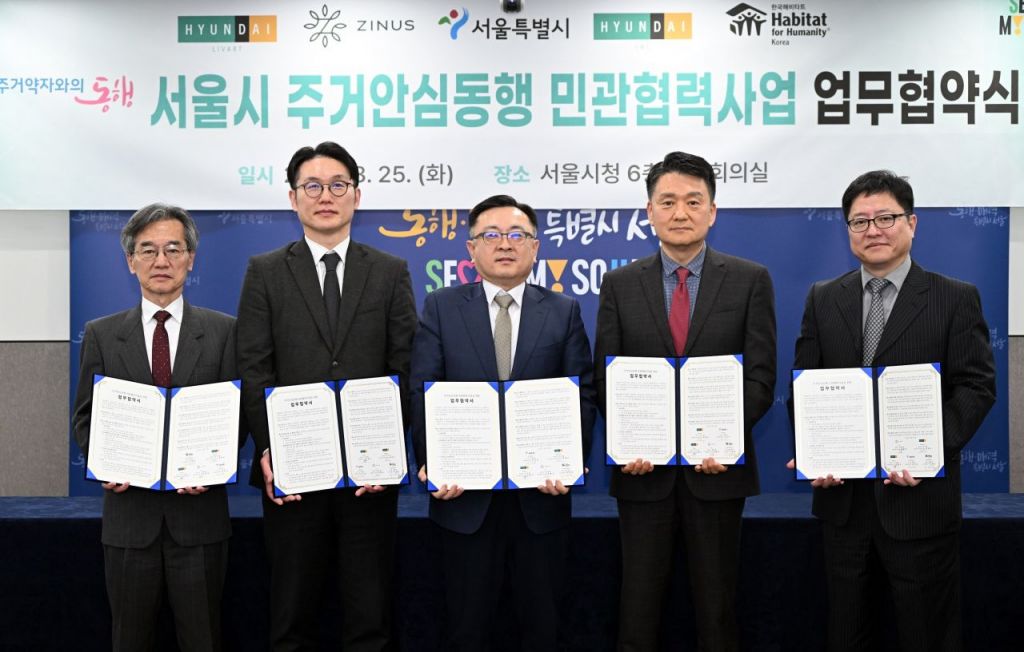 현대백화점그룹 리빙·인테리어 계열사들이 25일 서울시, 한국해비타트와 취약계층의 주거환경개선을 지원하기 위한 '주거안심동행 민관협력사업' 업무협약을 체결했다. 왼쪽부터 이광회 한국해비타트 사무총장, 김형국 현대L&C 영업전략실 상무, 김성보 서울시 행정2부시장, 권태진 현대리바트 라이프스타일본부 전무, 박형일 지누스 영업본부 부사장.
