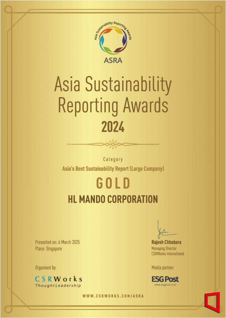 HL만도는 '2024 아시아 지속가능보고서 어워즈(ASRA)'에서 대기업 부문에서는 국내 처음으로 최고 등급인 금상을 받았다고 26일 밝혔다.