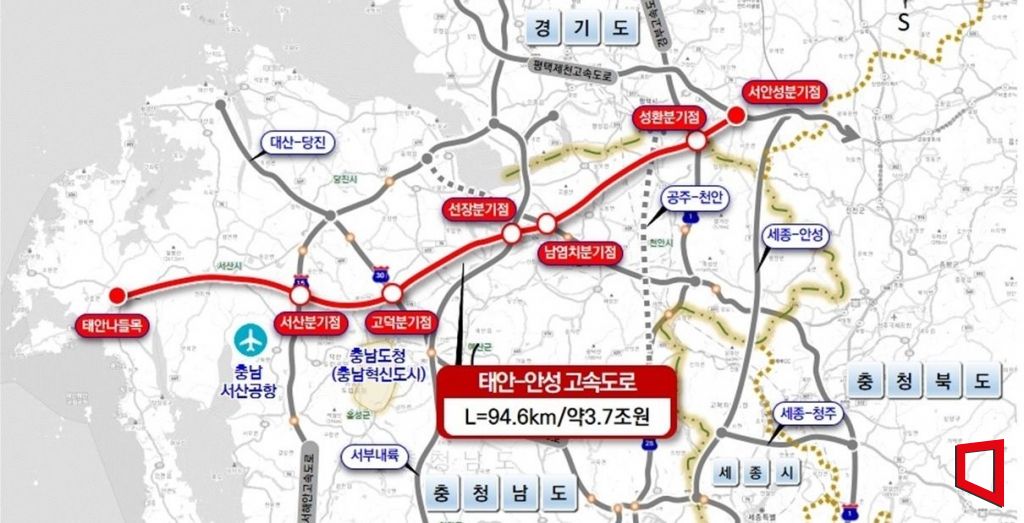 태안-안성 고속도로는 태안군 태안읍에서 서산, 당진, 천안 등 도내 5개 시군을 거쳐 경기도 안성까지 94.6㎞에 3조7000억 원의 사업비가 투입된다.