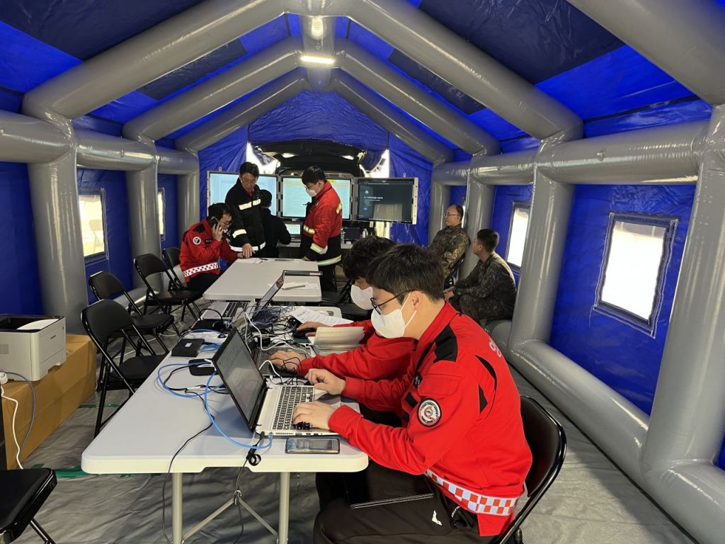 김광열 영덕군수(오른쪽)가 현장지휘본부에서 보고를 받고 있다. 영덕군 제공
