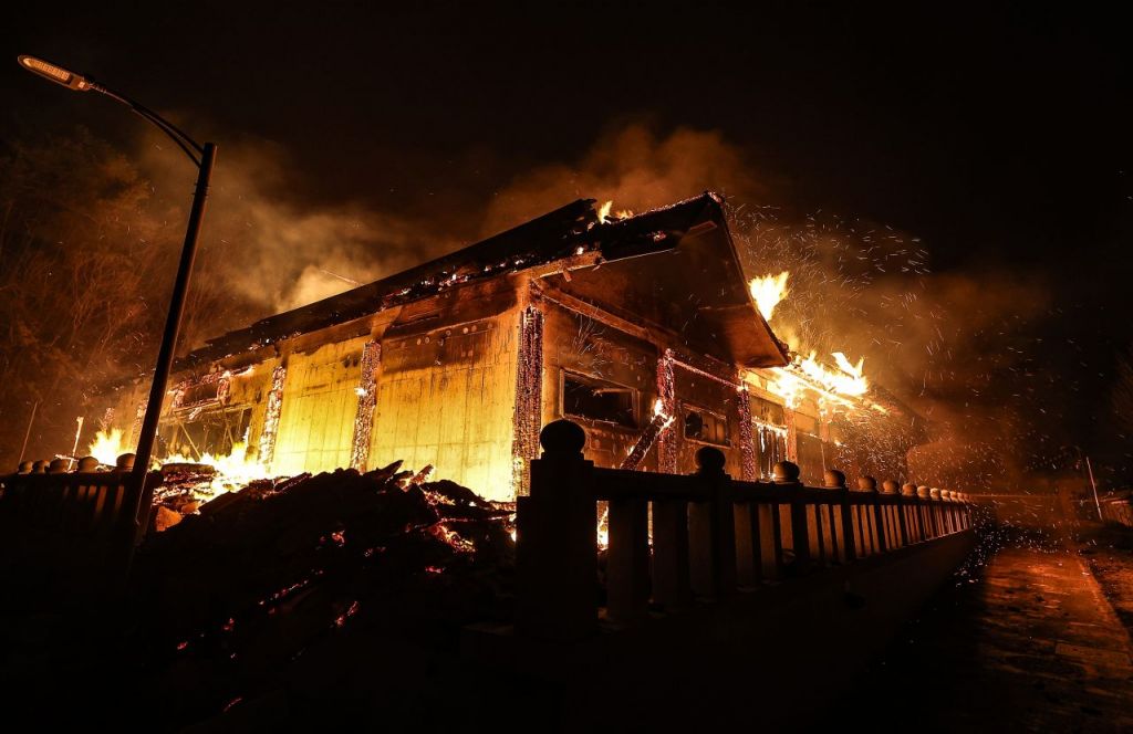 경북 의성군 산불 발생 나흘째인 25일 의성군 고운사 입구 인근에 세워진 최치원 문학관이 전소됐다. 연합뉴스