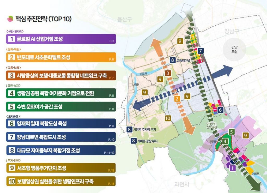 그중 파급효과가 크고 주민 수요를 반영한 6가지 분야의 핵심 추진전략 10개를 선정해 중점적으로 추진해 나갈 계획이다. 산업·일자리 분야에서는 글로벌 AI산업거점을, 문화·예술 분야에서는 반포대로 서초문화벨트를 조성한다. 또, 교통·보행 분야에서는 사람 중심의 보행·대중교통 통합형 네트워크를 구축한다.