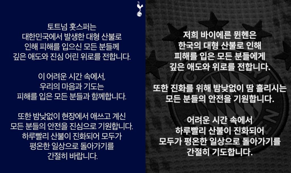 토트넘과 바에에른 뮌헨의 공식 인스타그램에는 경북 지역 산불 사태에 대한 위로와 애도와 글이 한글로 올라와 있다. 토트넘·바이에른 뮌헨 인스타그램