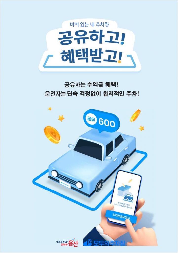 ‘모두의 주차장’ 앱을 통해 이용 가능한 공유 주차장 정보를 실시간으로 제공하면 운전자들은 결제 후 바로 주차할 수 있다. 주차장 공유 날짜, 시간대 및 주차 요금은 공유자가 자율적으로 정할 수 있다. 공유로 발생한 수익금의 70%는 현금 정산 후 지급된다. 참여를 희망하는 구민은 용산구청 주차관리과(02-2199-7804)로 문의하거나, 구 홈페이지 내 네이버 폼을 통해 신청하면 된다.