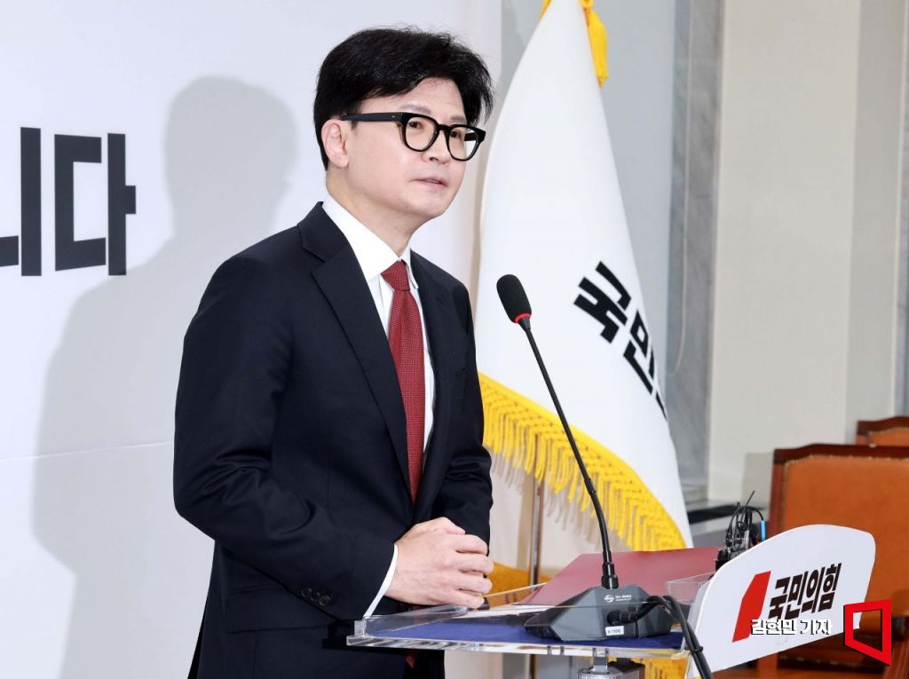 한동훈 국민의힘 대표가 12일 국회에서 윤석열 대통령 탄핵과 관련한 긴급 기자회견을 하고 있다. 김현민 기자