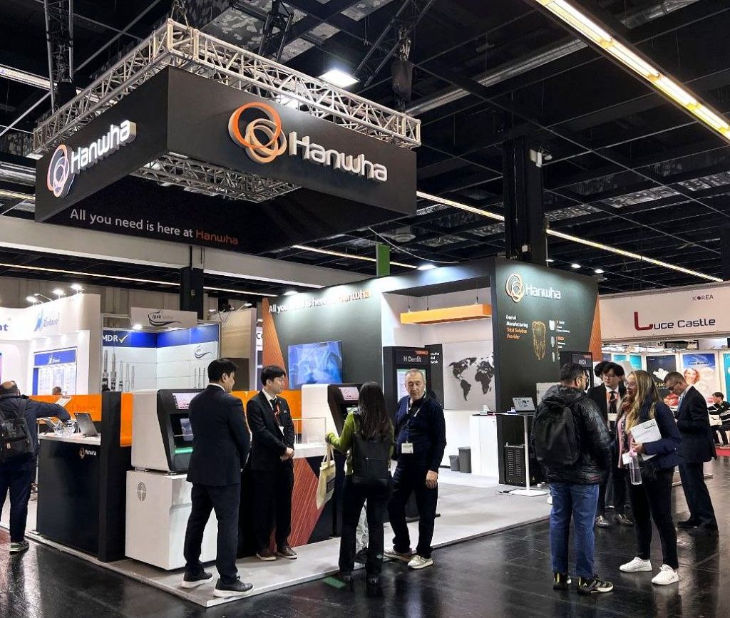오는 29일(현지시간)까지 독일 쾰른에서 열리는 세계 최대 치과의료기기 전시회 'IDS 2025'에 설치된 한화세미텍 부스 전경. 한화세미텍 제공