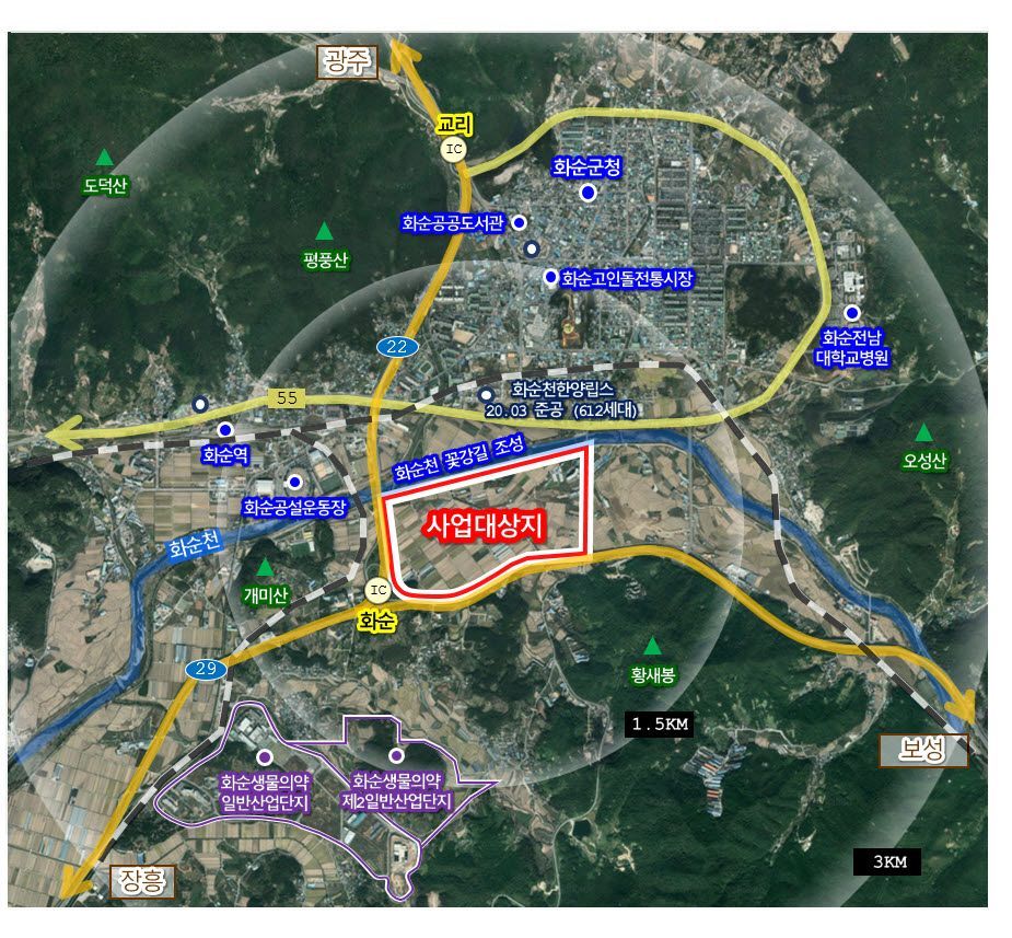 2032년 준공을 목표로 주거·상업·복합 시설 및 공공시설 등에 3,300억 원의 사업비를 투입해 화순 인구 10만 시대를 열 것으로 기대된다.