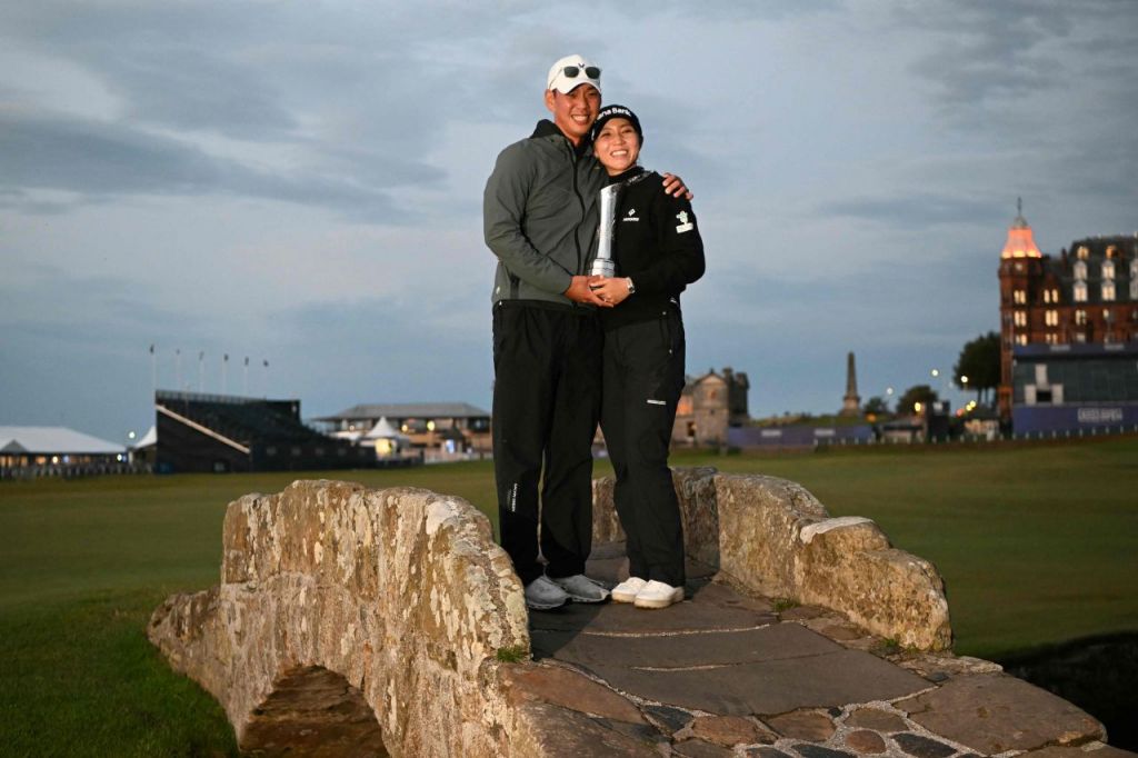 리디아 고가 2024 브리티시 위민스 오픈에서 우승한 뒤 남편 정준 씨와 트로피를 들고 환하게 웃고 있다. 세인트앤드루스(스코틀랜드)=AFP·연합뉴스