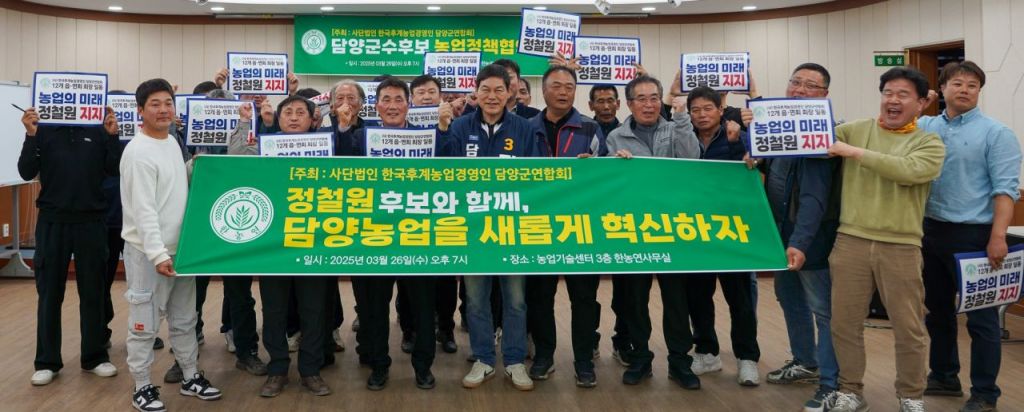 한국후계농업경영인 담양군연합회(회장 서정범)가 4·2 담양군수 재선거에서 정철원 조국혁신당 후보에 대한 지지를 공식 선언했다.