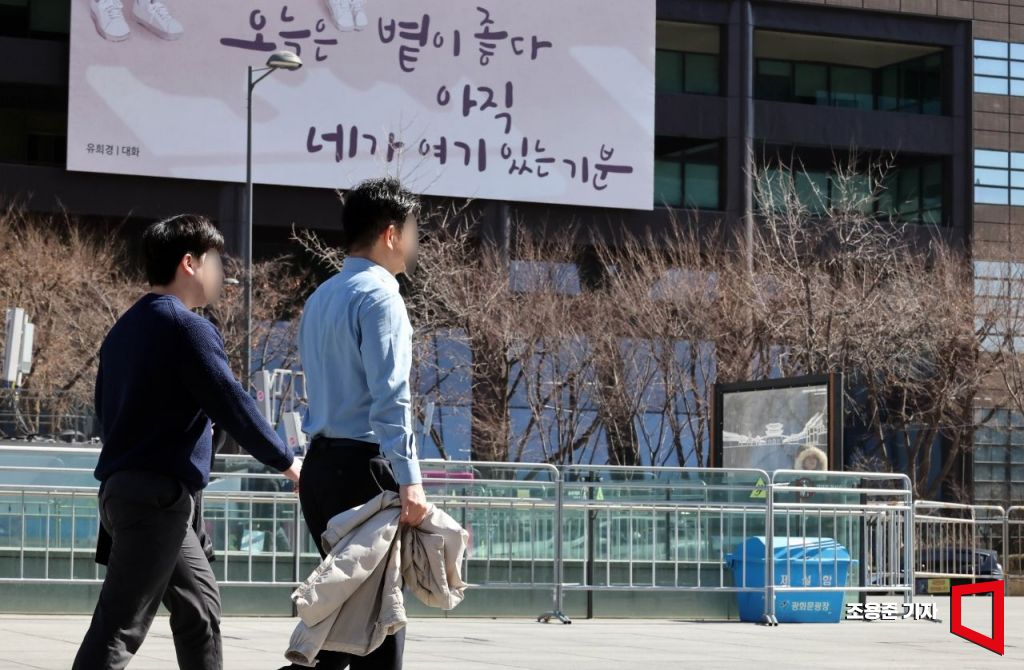 지난달 26일 종로구 광화문광장을 찾은 시민들이 겉옷을 벗어 손에 들고 이동하고 있다.
