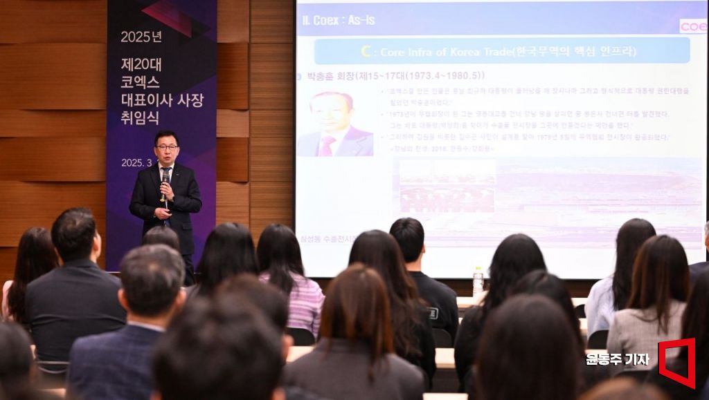 코엑스는 20대 신임 대표이사 사장으로 조상현 전 한국무역협회 국제무역통상연구원장을 선임했다. 27일 서울 강남구 코엑스에서 열린 취임식에서 조 신임 사장이 취임사를 하고 있다. 조 사장은 부산 출신으로 부산대학교 경영학과, 한국해양대학교 물류시스템공학과 석사과정, 부산대학교 무역학과 경제학박사를 거쳤다. 1990년 한국무역협회에 입사해 스타트업글로벌지원실장과 국제무역통상연구원장을 역임했다. 임기는 3년(2028년 3월까지)이다.