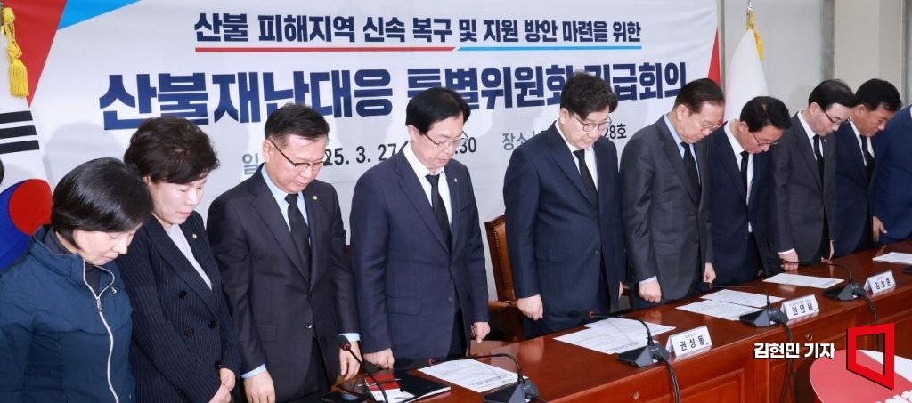 권영세 국민의힘 비상대책위원장과 권성동 원내대표 등이 27일 국회에서 열린 산불재난대응 특별위원회 긴급회의에서 산불 희생자를 위한 묵념을 하고 있다.