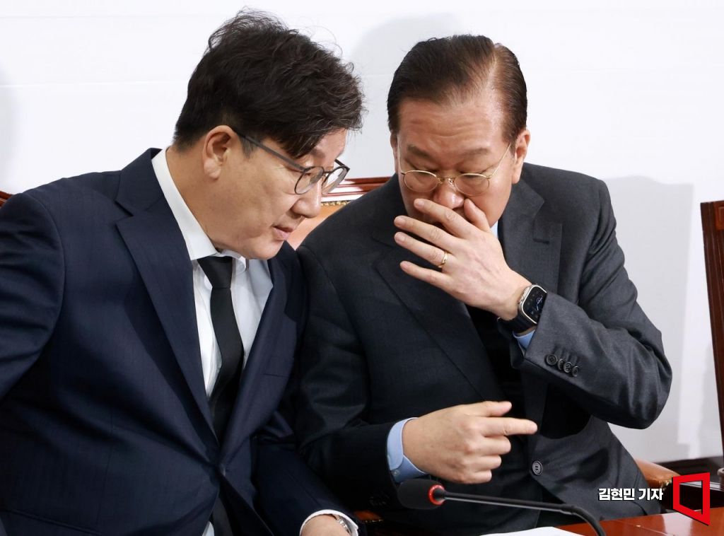권영세 국민의힘 비상대책위원장과 권성동 원내대표가 27일 국회에서 열린 산불재난대응 특별위원회 긴급회의에서 대화하고 있다.