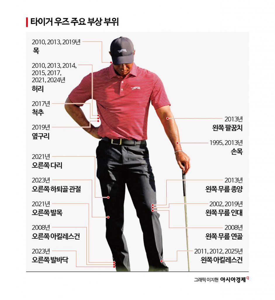우즈는 무릎과 손목, 아킬레스건, 목, 허리 등의 수술을 받고도 필드로 돌아오는 기염을 토했다. 1996년 10월 6일 미국프로골프(PGA) 투어 라스베이거스 인비테이셔널에서 첫 우승을 신고한 이후 통산 82승을 쌓았다. 24세에 최연소 커리어 그랜드 슬램을 작성했고, 메이저 대회에서 15승을 수확하는 등 절대강자의 시기를 누렸다. 2019년 10월 조조 챔피언십이 마지막 우승이다. 2021년 자동차 전복 사고 이후에도 아직도 선수로 뛰기 위해 도전하고 있는 우즈의 부상일지를 살펴봤다.