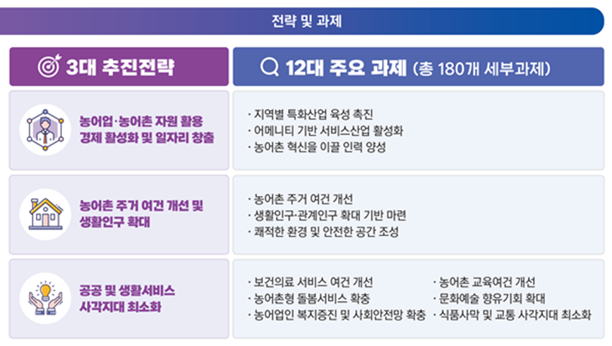 그동안 정부는 2004년 농어업인 삶의 질 향상 및 농어촌 지역개발에 관한 특별법 제정 이후 총 178조원을 투입해 4차례 기본계획을 시행해왔으나, 청년층 유출과 일자리 부족 등 구조적 문제는 여전히 남아 있다. 특히 인구 2000명미만 읍·면은 2000년 177곳에서 2023년 392곳으로 두 배 이상 늘었고, 전국 행정리의 73.5%는 소매점조차 없다.