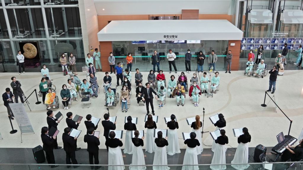 의정부을지대병원 환자와 교직원들이 27일 오전 병원 로비에서 열린 을지 미니 콘서트에서 의정부시립합창단의 노래를 감상하고 있다. 의정부을지대병원 제공