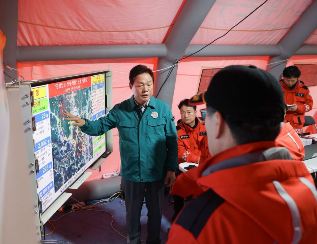 27일 박완수 도지사는 산청 산불이 지리산 국립공원으로 확산한 상황에 대해 깊은 우려를 표하며 “지금은 대한민국 1호 국립공원을 지켜내야 할 절체절명의 순간”이라고 강조하곤 전방위적 대응을 긴급 지시했다.