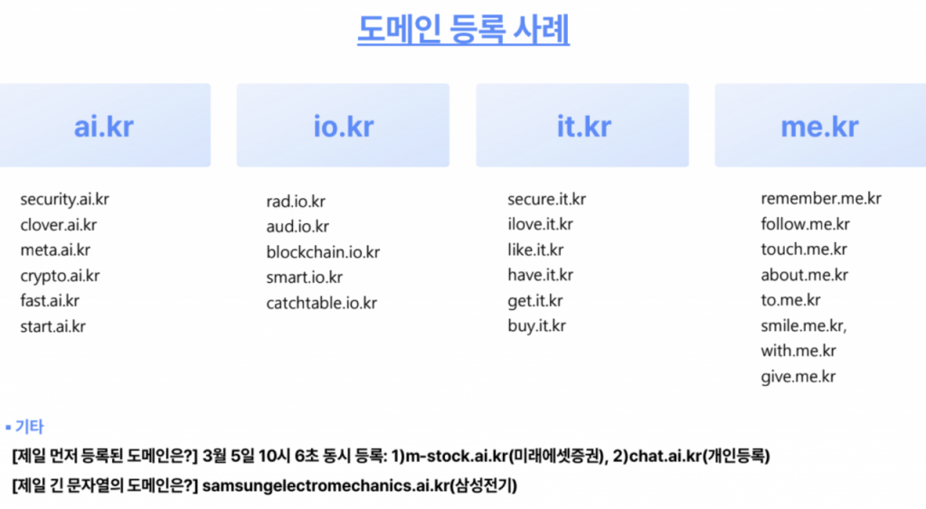 가장 먼저 등록된 도메인은 미래에셋증권(m-stock.ai.kr)과 개인이 등록한 'chat.ai.kr'이다. 이는 지난 5일 오전 10시6초에 동시 등록됐다. 현재까지 등록된 도메인 중 삼성전기(samsungelectromechanics.ai.kr)의 이름이 가장 길다.