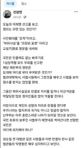 그러면서 신 시장은 "권순일 전 대법관 같은 사람들과 이번 판결의 판사 같은 법관들의 악영향은 매우 심각하다"며 "사법부 견제가 하나도 없는 우리 사회에 새로운 견제 제도가 필요한 상황으로 보인다"고 비판했다.