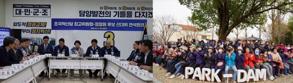정철원 담양군수 후보 선거사무실에서 열린 조국혁신당 현장 최고위원회의(왼쪽)와 담양읍 중앙공원에서 열린 집중 유세장에 모인 유권자들. 정철원 후보 제공