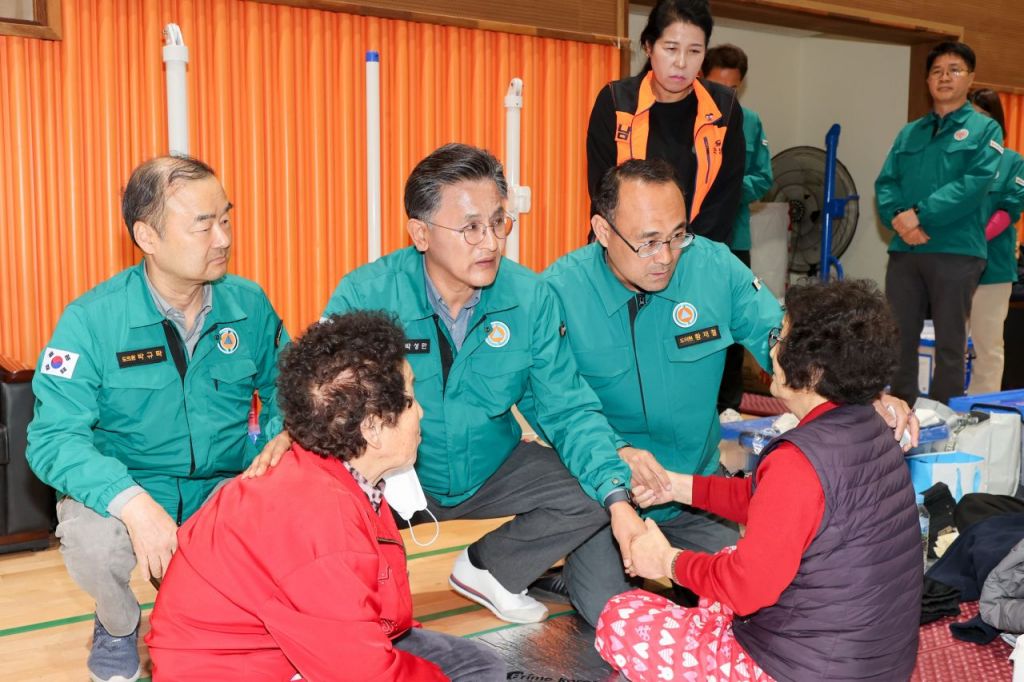 경북도의회 박성만 의장(중앙)과 박규탁의원 (왼쪽), 황재철 의원(오른쪽)이 영덕지역 산불피해 대피소를 찾아 구호품을 전달한 뒤 이재민들을 위로하고 있다.