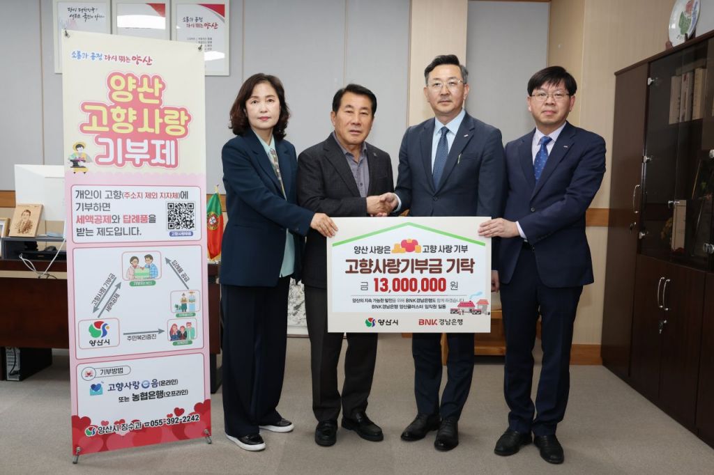 BNK경남은행 임직원 130명이 양산시 고향사랑기부제에 동참해 1300만원의 고향사랑기금을 기탁했다고 전했다.