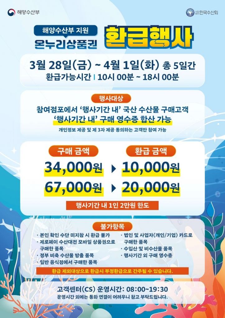 행사 대상 품목에는 국내산 원물이 70% 이상 포함된 젓갈류 등 가공식품도 포함된다. 단 일반음식점에서 구매한 품목, 제로페이 수산대전 모바일 상품권으로 구매한 품목, 정부 비축 수산물 방출 품목, 수입산 수산물은 환급 대상에서 제외된다.