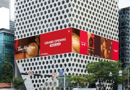 서울시 강남구 신논현역 인근에 자리한 팀홀튼 신논현역점의 개점 일정을 안내하는 옥외광고. 팀홀튼 제공