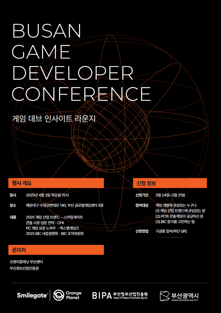 부산시(시장 박형준)와 부산정보산업진흥원(원장 김태열)은 스마일게이트 오렌지플래닛 창업재단과 오는 4월 3일 오후 3시 해운대구 부산문화콘텐츠콤플렉스에서 ‘부산 게임개발자 컨퍼런스: 게임 데브 인사이트 라운지’를 개최한다.