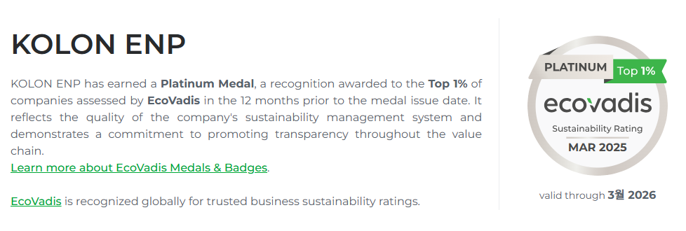 코오롱ENP가 글로벌 ESG(환경·사회·지배구조) 평가기관 에코바디스 평가에서 최고 등급 '플래티넘'을 획득했다,